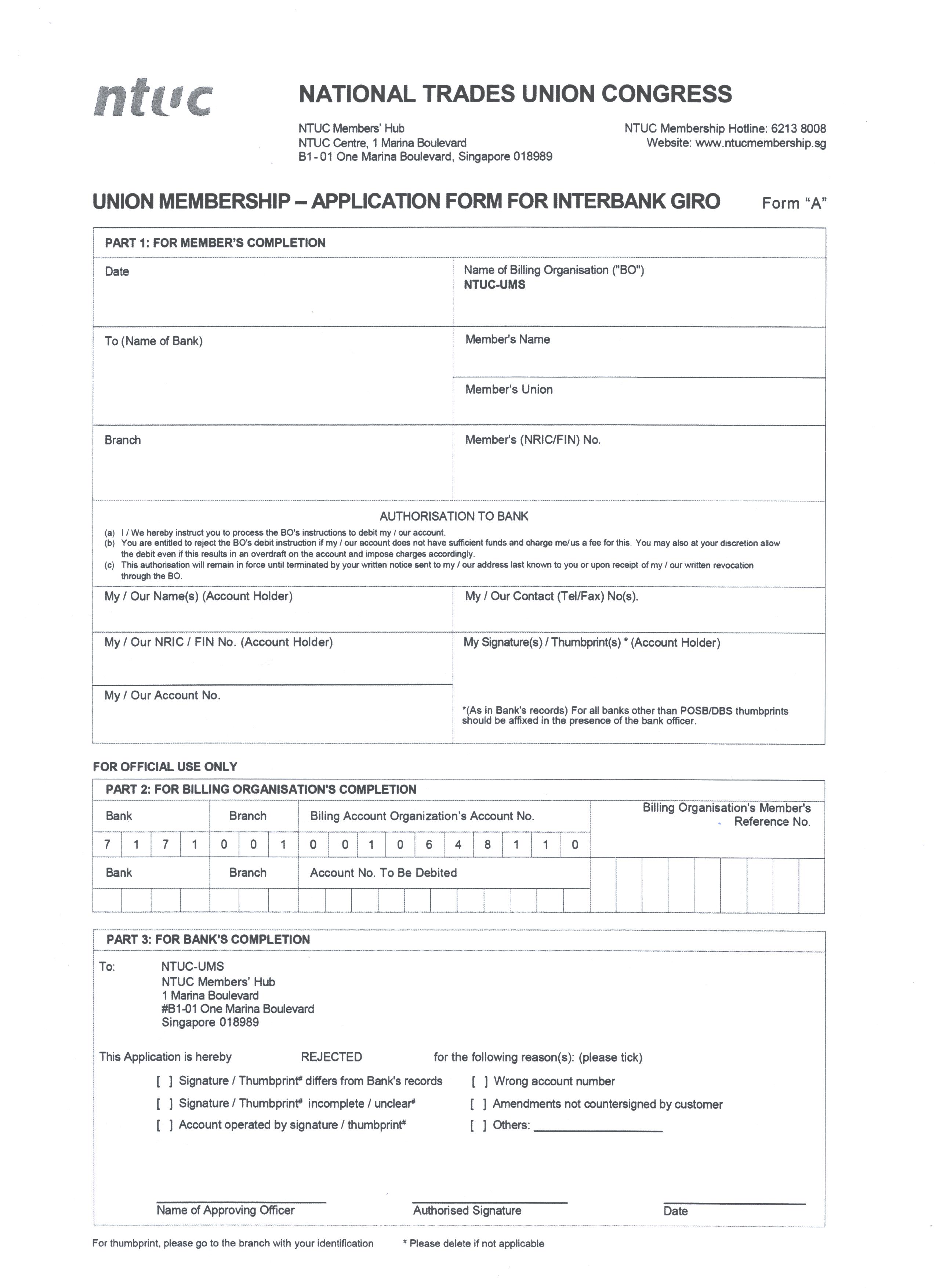 Submit this application form together with either our Inter-Bank GIRO Form, OR, NTWU Check-Off Form.